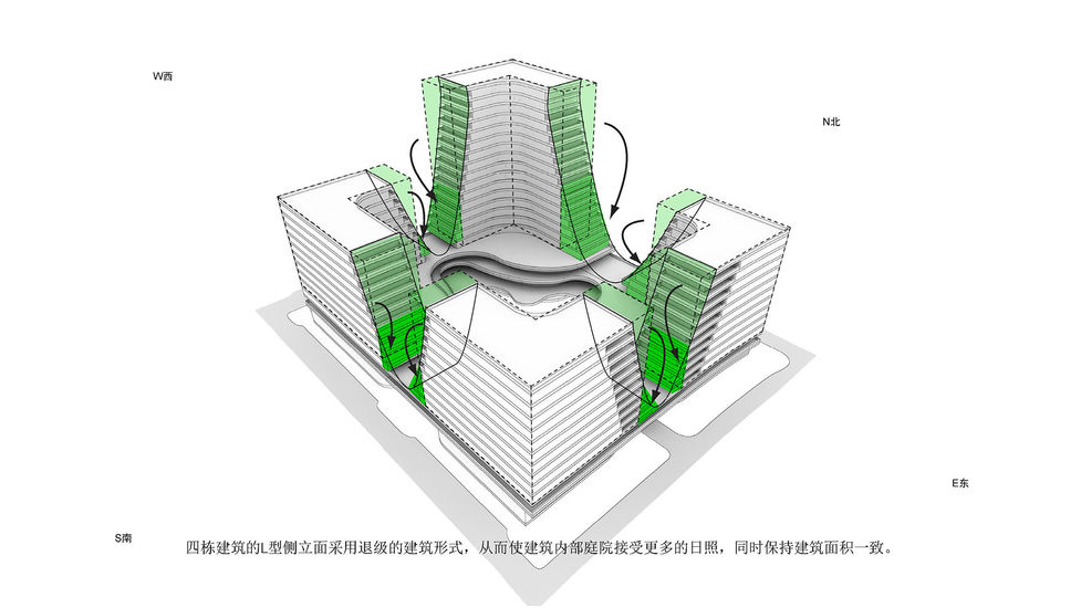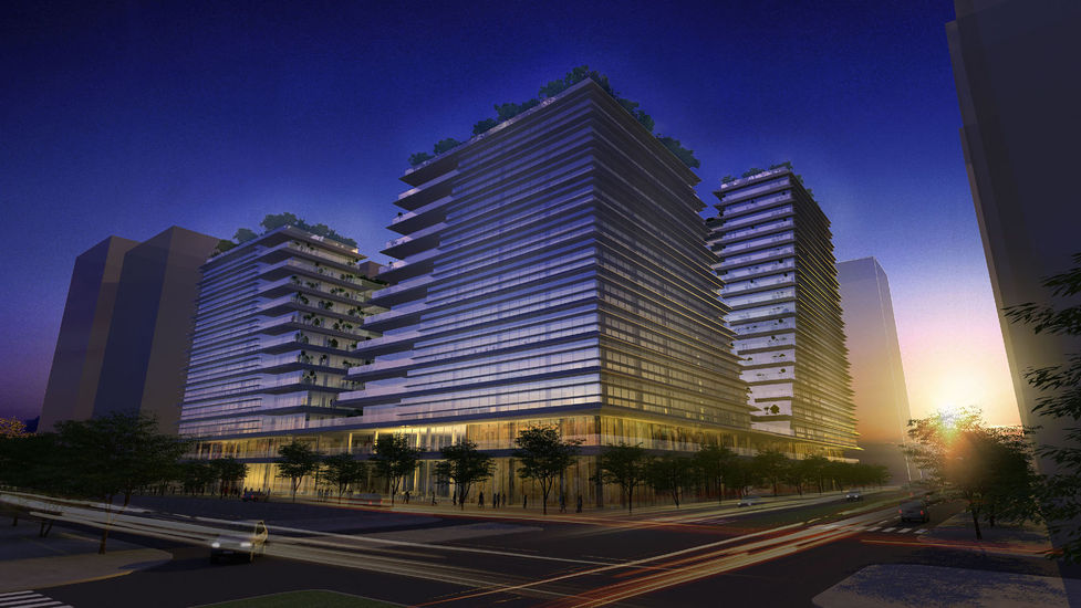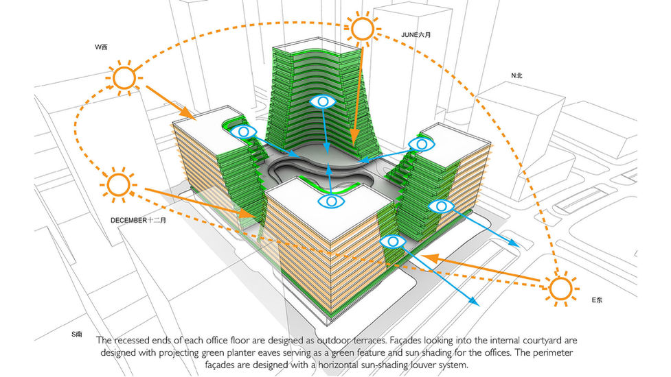 Our design for the Alibaba Office HQ uses a raised public platform to connect 4 office buildings, representing the corporate mission and values of openness and cooperation.